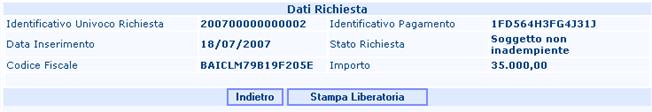 Inoltre è possibile tornare indietro alla pagina di ricerca, stampare la pagina oppure annullare la richiesta cliccando rispettivamente su “Indietro”, “Stampa Pagina”, “Annulla Richiesta”.