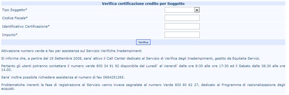 Cliccando sulla voce del menu “Verifica Inadempienza Certificazione Credito” si presenta la videata di inserimento dei dati che verranno utilizzati per la certificazione del credito per il soggetto.
