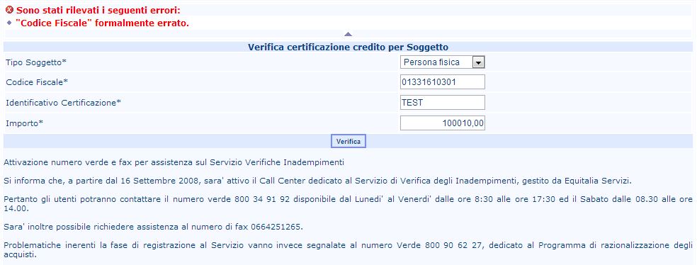 Figura 43: “Verifica Certificazione Credito” – errore codice fiscale formalmente errato![]()