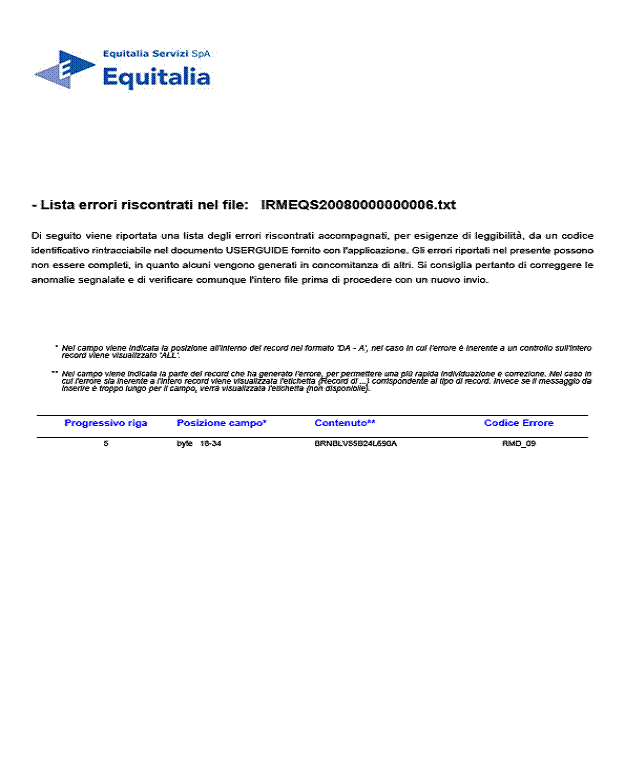 "Sigla e/o Codice Equitalia Servizi del Record di Testa non congruente";